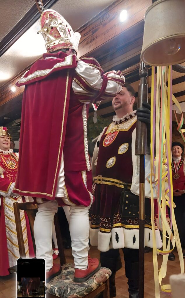 Demzufolge erreichte unser Prinz Jens auch nur mit Hilfe eines Stuhls die erforderliche Höhe um dem Bauer Alex den Orden um den Hals zu hängen: