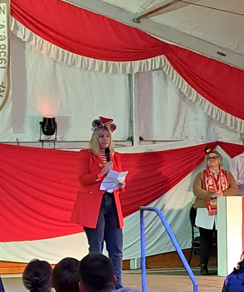 Immer präsent: unsere Bürgermeisterin Jennifer Meuren war zu Gast, hatte eigens für unsere Tollitäten ihre Grußworte in Reim gefasst.