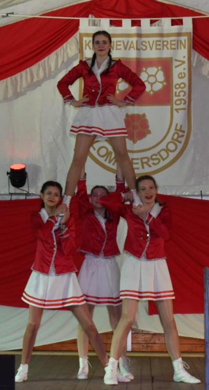 Was wäre Lommersdorf, was wäre unser Karneval ohne die Funkengarde… Schon die Großeltern der jetzigen Akteure standen in Gardeuniformen ( wenn auch um einiges einfacher) auf der Bühne. Unter der Leitung von Elke Schomers bieten sie jedes Jahr mit noch gewagteren akrobatischen Einlagen auf. Mit jedem Jahr werden auch die Beine der Gardisten lockerer und die Arme stärker.